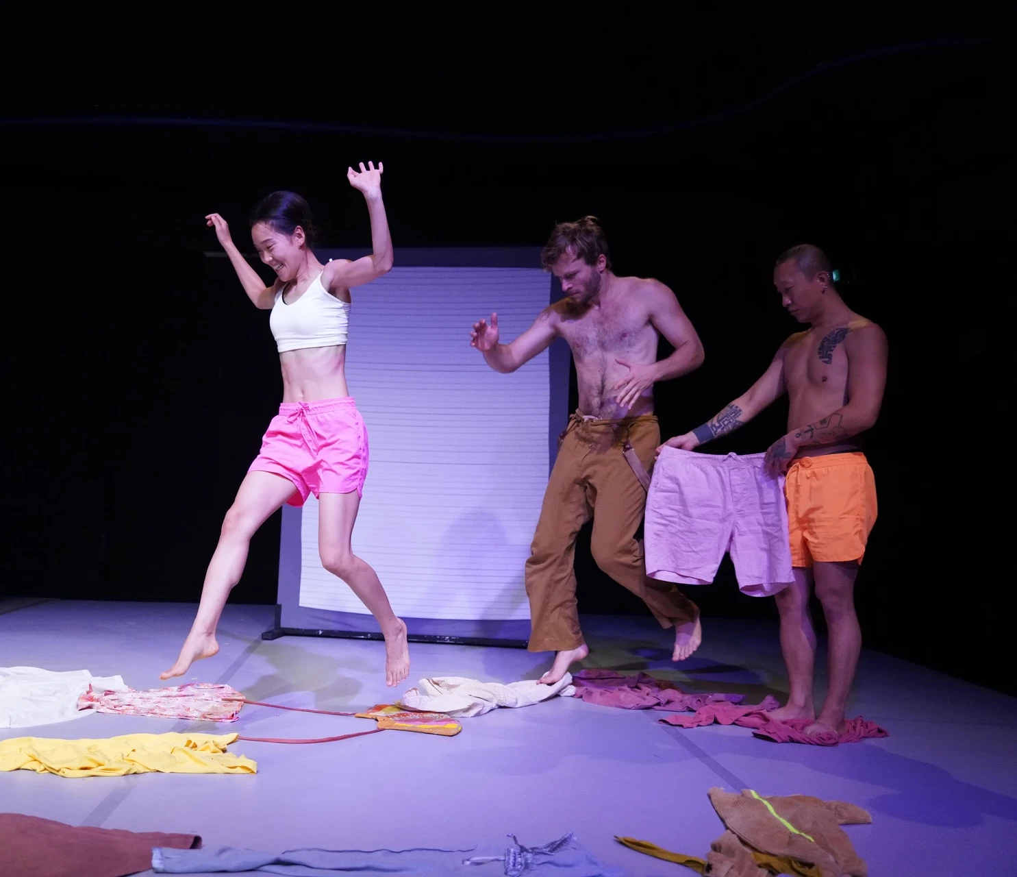 Drei Tänzer*innen lassen sich ein auf das „Spiel im Spiel“: Wer gerade ein Hut war, wird zur lebensrettenden Insel im stürmischen Meer. Wo gerade noch der Boden unberührbar war, robbt jetzt ein großer Wurm über die Bühne. Wer eben noch klein war, wird riesengroß und lässt die Muskeln spielen. Wer gerade noch gestritten hat, tanzt jetzt im Gleichklang.