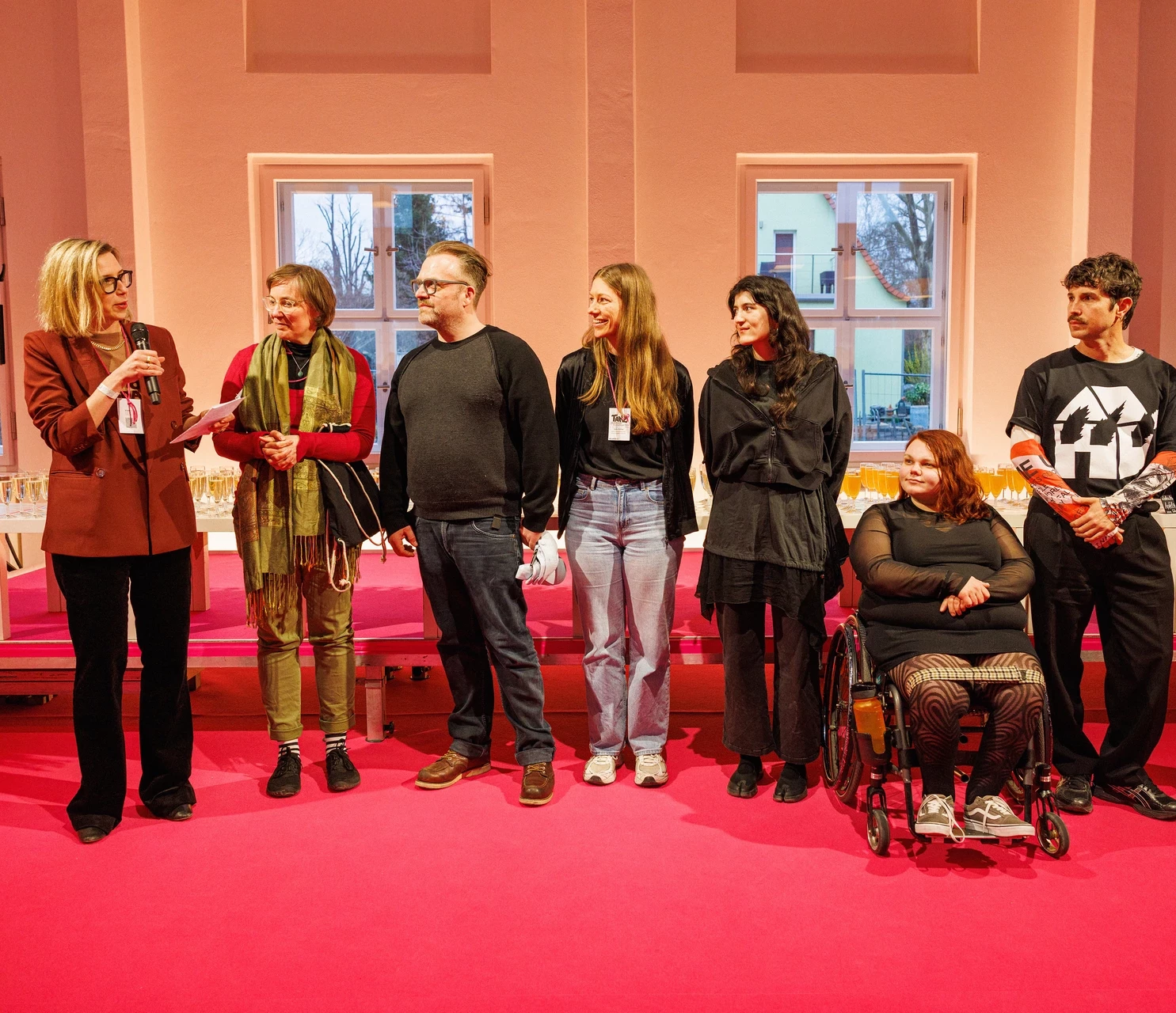 Umso schöner – und zugleich aufschlussreich –, dass ein Pitching mit in Sachsen lebenden Künstler*innen genau hier stattfindet. Ich ermahne mich, diese Präsentationen nicht vorschnell als potenzielle Showcase-Beiträge zu lesen. Der eigentliche Wert liegt in der Begegnung. Und doch ist spürbar: Für manche geht es um Sichtbarkeit – für andere um strukturelle Fragen, um Netzwerke, um Zukunft. So etwa bei der Forward Dance Company, die 2023 den Deutschen Pavillon der Biennale di Venezia bespielte. Hier geht es weniger um Bekanntheit als um künstlerische Konstellationen – etwa für den Leiter Gustavo Fijalkow, der mit wechselnden Choreograf*innen – unter anderem auch schon mit Elsa Artmann – arbeitet. Ein Modell, das in der freien Szene fast schon radikal wirkt: Kontinuität in der Kompanie, Wandel in der Handschrift. Ganz anders Irina Pauls, die keine Kompanie braucht, sondern für ihren „Maientanz in Espenhain“ wirbt. Mit einfachen Bändern – fast wie ein Maibaum – aktiviert sie die Zuhörer*innen damit zu spielen. Ihre Praxis setzt auf Simplizität, nicht als ästhetische Reduktion, sondern als soziale Öffnung: Kreistanz als Begegnung.